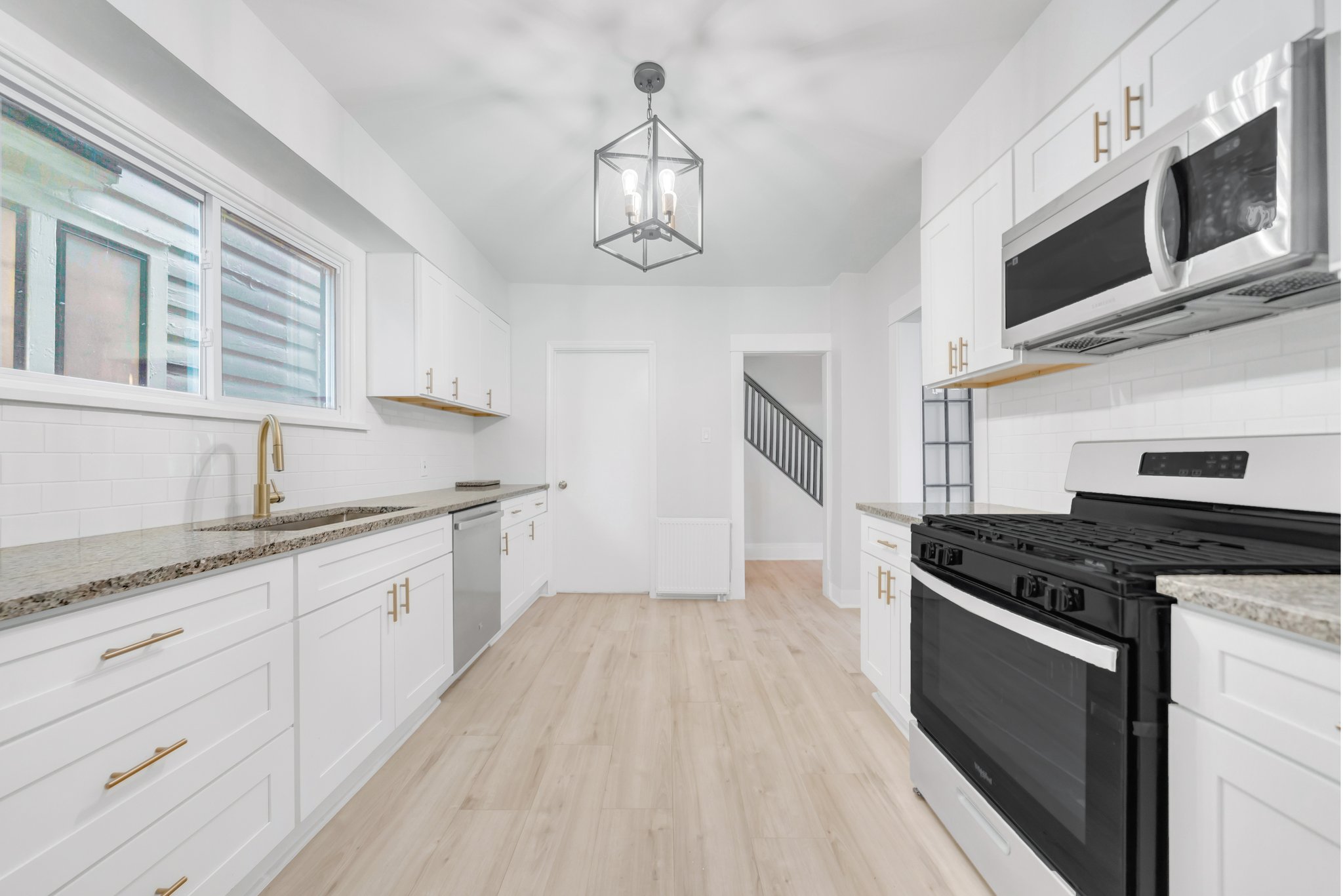 New kitchen abundant with cabinets, granite counters and stainless steel appliances. Adjacent first floor laundry room and half bathroom.
